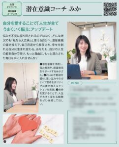 人生が全てうまくいく 女性になる 潜在意識から変えて、 自分に自信と「想像以上の幸せ」を Question こんなお悩みございませんか? 自己否定が強い 自分に自信が持てない 人間関係・夫婦仲に悩みがある 叶えたいことがあるが叶え方が分からない 仕事に不満がある 子育てにイライラして疲弊している 家族に尽くしてばかりで「私の人生これでいいのかな」と思ってしまう 叶えたい夢があるけれど無理だと思ってあきらめたでもモヤモヤする そのお悩みお任せください “努力する引き寄せ”から、 “自然に叶う私”へ 仕事、結婚、出産……どんなライフステージにいても、ちゃんと自分を認め、理解しながら、自分の幸せに向かって舵を取って進んでいける。そんな女性を増やしたいという想いから、本物の自己肯定感を育てるサポートをしています。頑張っているのにどこか満たされない、そんなあなたも大丈夫。潜在意識から整えることで、安心感のある毎日へと自然に変わっていきます。かつては諦めていた幸せも、するりと手にできる未来へ。一緒に歩んでいきましょう。 \ LINEでお申し込み簡単 / まずは個別相談を受けてみる お問い合わせ > LINE友達追加 > Features 特徴 Features 01 潜在意識の特徴を熟知したサポート 潜在意識には特徴があり、それを知らずに頑張り続けると、変化が続かなかったり、かえって苦しくなることがあります。大切なのは行動そのものではなく、「どんな前提や思考で動くか」という意識の在り方。私の講座では、専用サイトで基礎を学びつつ、個別セッションやLINEで丁寧に寄り添い、潜在意識に沿ったアドバイスを行っています。土台から整え、安心して変化を重ねていけるお手伝いをいたします。 Features 02 取り組むべきことが明確で不安を生まないプログラム 私自身も多くのスクールや講座を受けてきて感じたのは、現実を変えるのを妨げるのは「不安」と「できていない感覚」だということです。学ぶ内容が多すぎると自己嫌悪や不安が生まれ、潜在意識に「私は変われない」という思い込みが定着します。だから私の講座では、シンプルに最短で自己肯定感を高め、願望実現できるようにし、悩みもすぐ解消できる内容にしています。 Features 03 どこよりも手厚い密なコミュニケーションで疑問もすぐに解消 潜在意識には「現状維持機能」があり、急に人生を変えようとすると無意識にブレーキがかかります。「私には無理かも」と思わせたり、思い通りにいかない出来事を引き寄せたりして、変化を妨げることもあります。だから私の講座では、個別で密にやり取りし、日常の小さな悩みや疑問もすぐ解消。思考が戻る前に軌道修正できる環境を整え、安心して着実に変化を積み重ねられる仕組みを提供しています。一人で悩まず、一歩ずつ一緒に前へ進んでいきましょう。 Future 受講後の未来 自分で人生を創る思考の土台が身につく 一般的なコーチングでありがちなのは、潜在意識の特徴を熟知できていなかったり、ベースの思考をしっかり整えることができず、講座が終わった後に自分一人ではどうしていいのか分からなくなるということです。コーチングを受け続けるのならいいのですが、現実的に難しいですよね。ですので私の講座では、講座期間中に脳の土台から整え、終了後に自分で自分を幸せに導いでいけることを大切にしています。女性の人生はライフステージとともに変化が大きいですよね。仕事、結婚、出産、子育て、更年期、両親との付き合い方…このどのステージにおいても、ちゃんと自分で自分を整え、一番の味方でいてあげられる。そして、自分でちゃんと、自分自身や身の回りの人を幸せに導いてあげられる。そんなゴールを目指してサポートさせていただいています。 Voice お客様の声 東京 / 30代 / 女性 自分を認められたら 仕事も夫婦仲も激変 私は1年前、育休明けが近づき「私の人生これでいいのか」と悩んでいました。育休前は仕事に楽しさを感じられなかったし、プライベートでも、日々夫に気を遣い、自分の思いもうまく伝えられず、暗い子育てをしていました。ですが、美香さんと出会って、まずいかに自分に厳しかったかに気付きました。夫や職場の人に認めてもらう以前に、自分で自分を認められていなかったのだと気づきました。また、夫に伝えたいことも美香さんとのセッションでまとめ、伝える際の気持ちの持ち方や実際の内容も一緒に考えていただけたことで、自分の気持ちを次第にさらっと伝えられるようになりました。今では、夫と深いコミュニケーションができるようになったように感じます。育休明けで仕事に復帰したのですが、以前よりも楽しく働けています。また、副業ですごくやりたい仕事を見つけてとんとん拍子にオファーが舞い込むようになりました。自分でも驚くスピードで公私ともに人生が激変し、毎日充実しています。美香さんに感謝です。 神奈川 / 30代 / 女性 顔色をうかがう自分を 卒業、自分軸に 私は仕